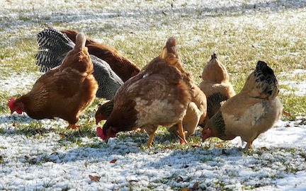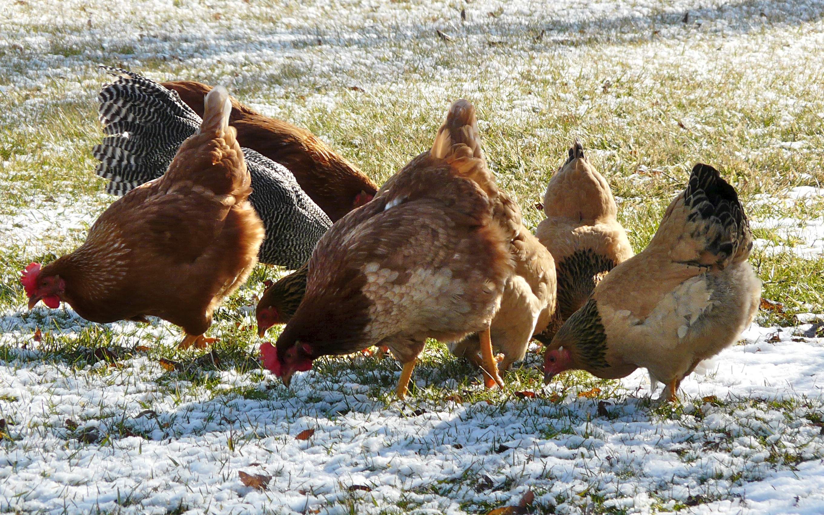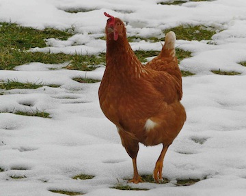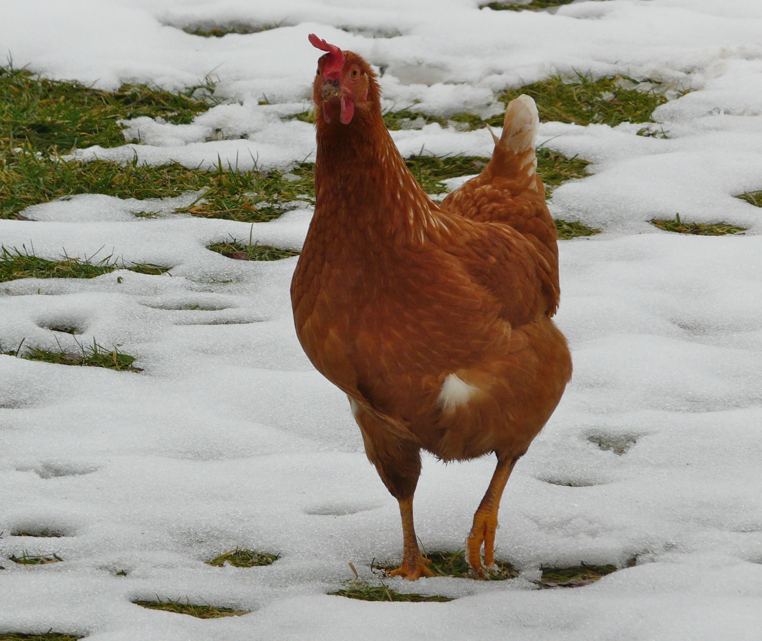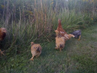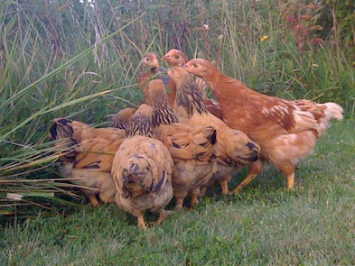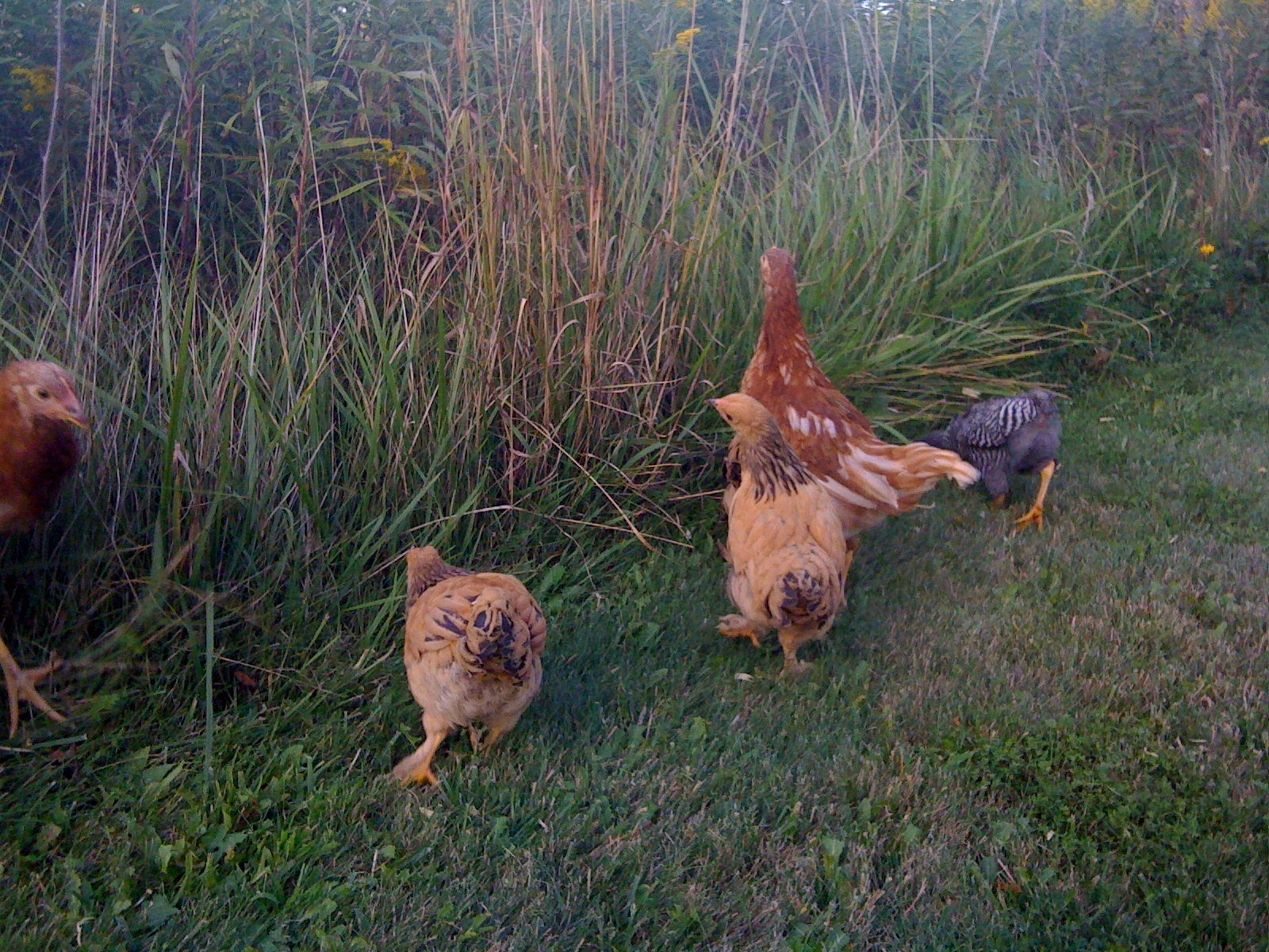 We have three Red Star (ISA Brown) hens and four Buff Brahma hens. On a typical day we get six eggs, three standards (avg. 64g) and three bantam (avg 35g). The USDA labels 64g eggs as Very or Extra Large. 35g eggs are Peewee. Our flock free ranges when we're home and the weather is nice. Their house and run is outside on the lawn for three seasons and moves indoors during the winter. They eat vegetarian chicken feed, greens (like Kale and Chard) and grass. In the winter they sometimes snack on seed blocks which do contain beef suet. When ranging they eat all manner of vegetation as well as various "bugs". All the eggs we give away are ultra-fresh (less than seven days old), sanitized and candled. We have four, six and dozen egg cartons. Call Pat or send mail to eggs@bodosom.net if you'd like some more.